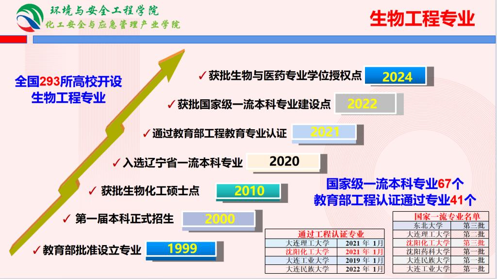 优势特色:生物工程专业于1999年经教育部批准设立,2000年开始正式招生,2020年获批辽宁省一流专业建设点,2021年通过中国工程教育认证,2022年获批国家级一流本科专业建设点。为适应生物医药产业作为我国战略新兴产业的发展要求,本专业突出生物制药和生物化工应用特色,创设职业真实背景的育人环境,着力提高学生创新能力和解决生物制造与加工过程中的复杂工程问题的能力,为生物工程及医药、化工等相关行业培养品德高尚、专业过硬、情商出众、强于实践、勇于创新的高素质应用型人才。获得省级教学成果二等奖等多项奖励。优秀毕业生可推荐免试攻读硕士研究生。