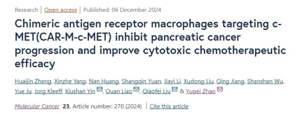本研究证明了CAR-M-c-MET在体外和体内模型治疗胰腺癌的安全性和有效性。CAR-M-c-MET细胞具有抑制胰腺癌进展和提高细胞毒性化疗疗效的能力。而且,在小鼠模型中未观察到明显的副作用。