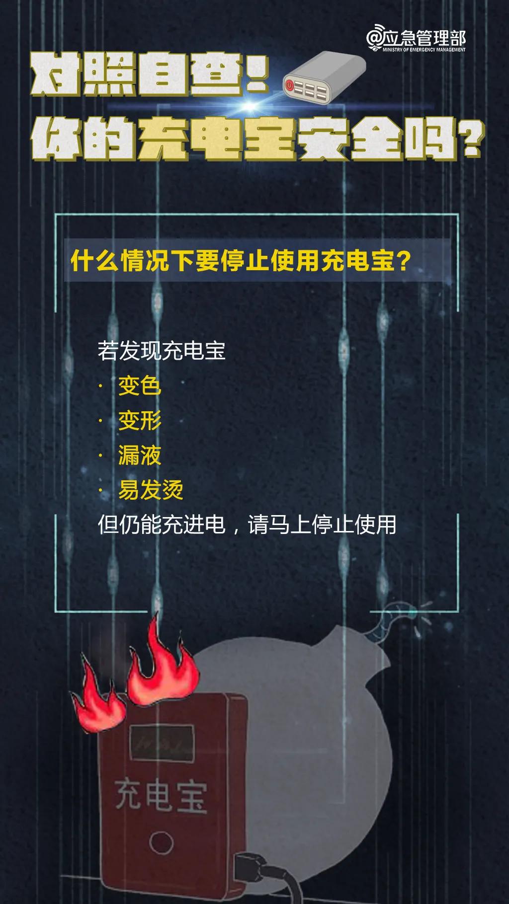 2021年9月,广东东莞一居民家中发生火灾,所幸消防部门扑救及时未造成人员伤亡。经初步调查,起火原因为整夜充电的充电宝内部电路故障。你的充电宝安全吗?什么情况下要停止使用充电宝?请对照自查!